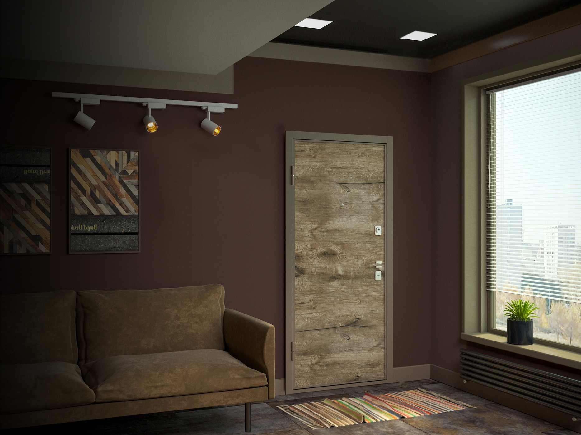 - Наружная отделка: Гладкий щит, цвет "Дуб канадский горизонт", покраска металла "Шоколадный муар"