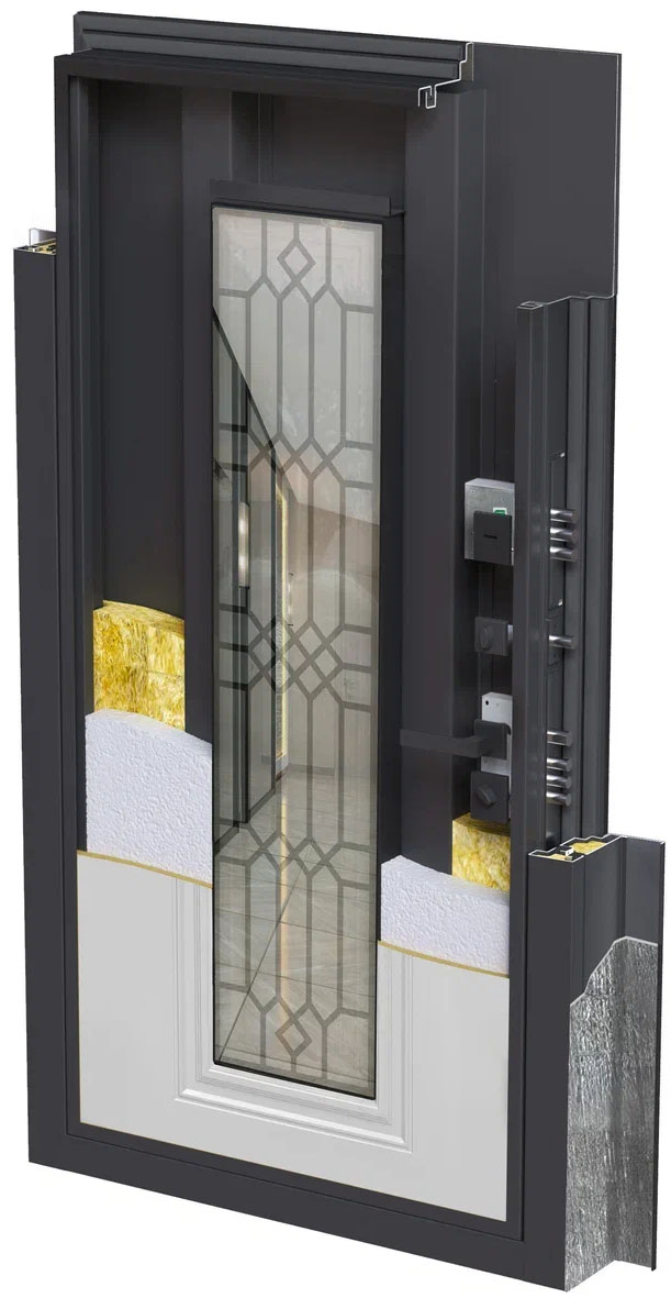 - 4-х камерный стеклопакет 81 мм, тонировка зеркальное серебро. Лазерная решетка внутри стеклопакета (муар черный)